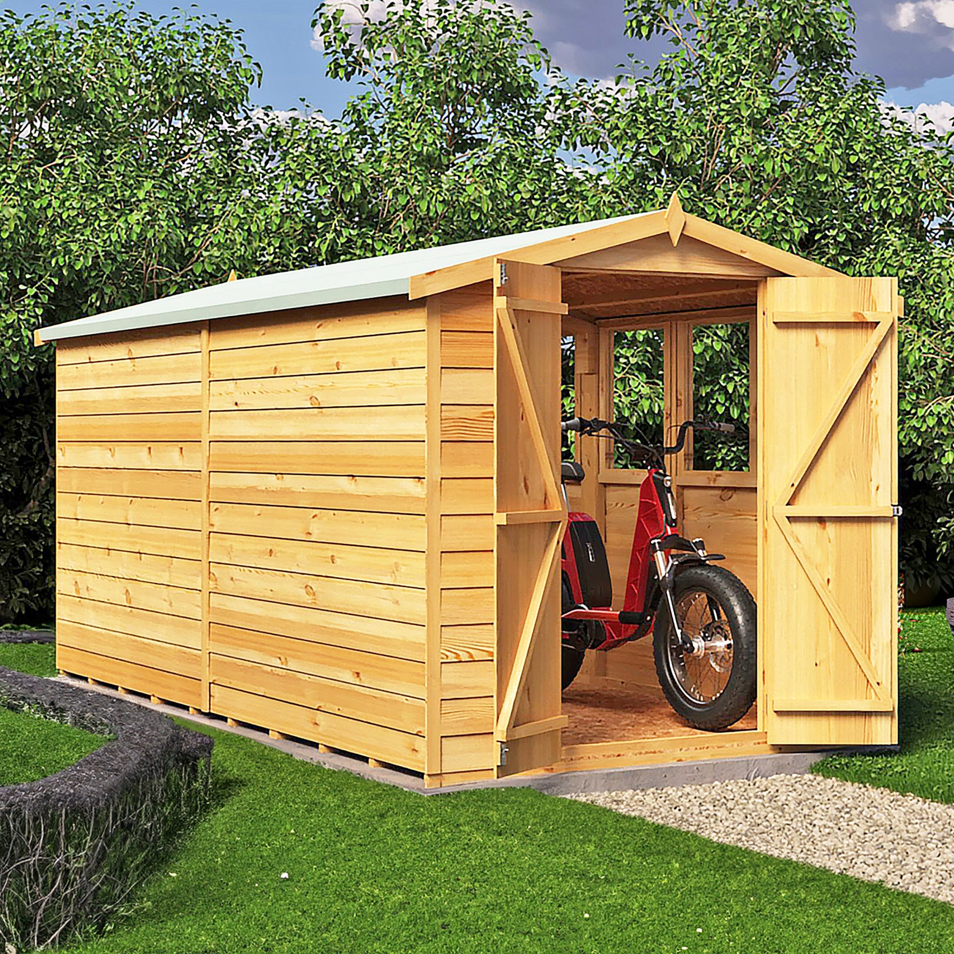 Part of our Garden Value range of overlap sheds. Double doors provide easy access to the entire space. This handy shed is manufactured from high grade, slow grown, FSC approved, European pine cladding boards over 34mm square framing with OSB roof and floor. With six fixed, acrylic windows that can go either side.