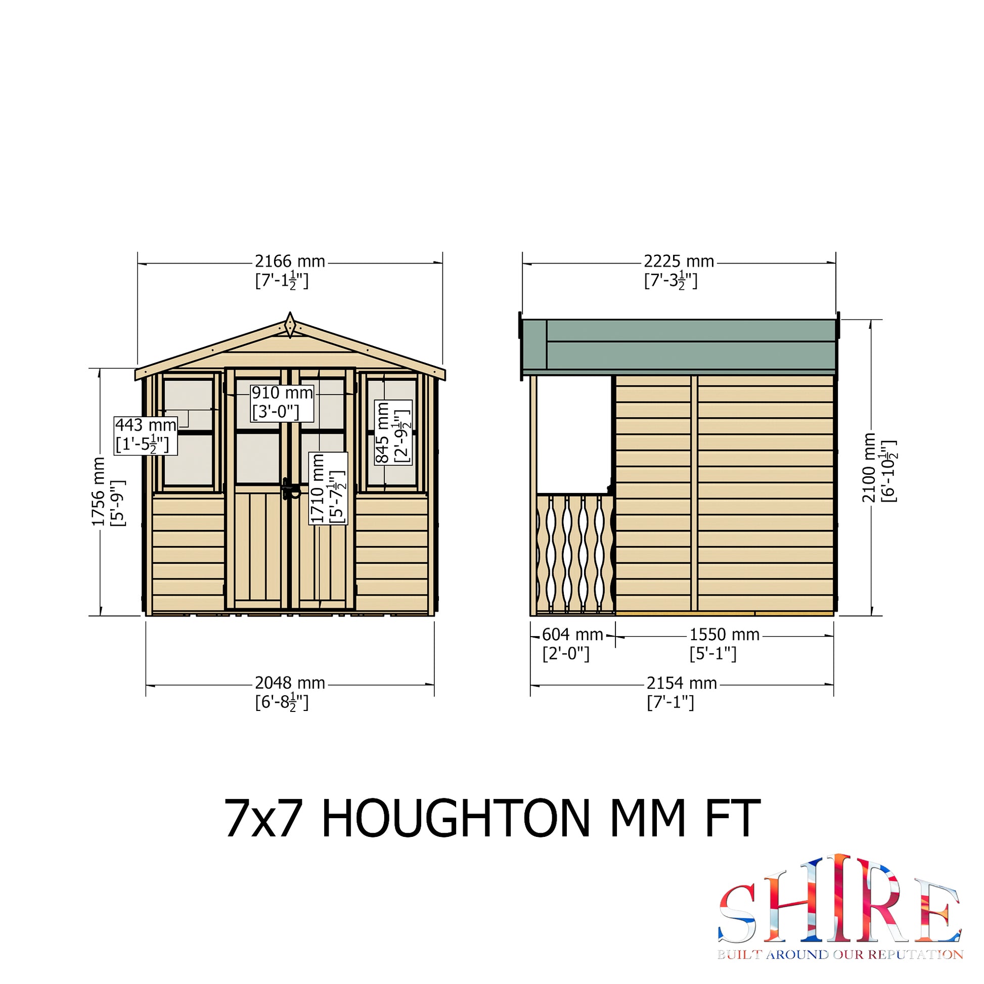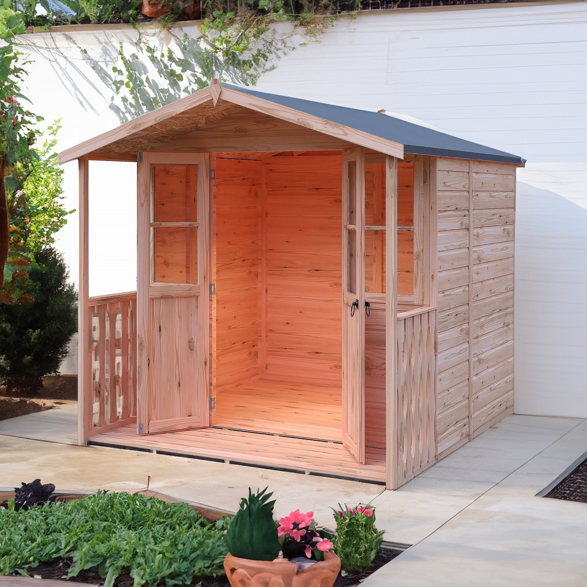 The Houghton Summerhouse is a traditional summerhouse with glazing across the width of the building and an attractive veranda. The practical, joinery quality, glass glazed double doors feature a traditional gate latch. There are two opening windows. It is constructed on sturdy 34mm square framing and clad with planed shiplap tongue and groove boards made only from the highest grade, FSC approved, slow grown northern European pine with OSB roof and T&G floor. Dipped base coat preservative ready for you to top coat.