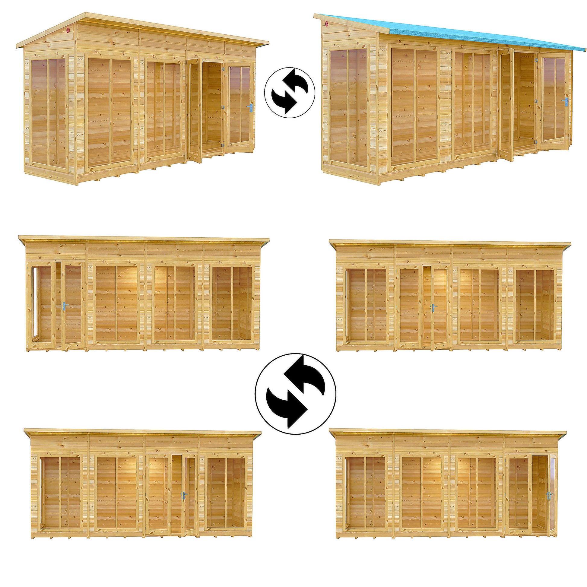 The stylish Lela Summerhouse is a valuable addition to your outdoor living - this modern garden room is perfect for summer dining and relaxing. With an eaves height of around 7 ft high, the Lela provides a very comfortable, spacious interior. The joinery made double doors are fitted with a mortice lock. The windows are fixed and all glazing is acrylic for your safety. The building is constructed on 34 mm square framing and clad with planed shiplap tongue and groove boards made only from the highest grade, FSC approved, slow grown pine. The floor and roof are 12mm matching T&G boards and the roof comes with felt supplied. Dipped base coat preservative ready for you to top coat.