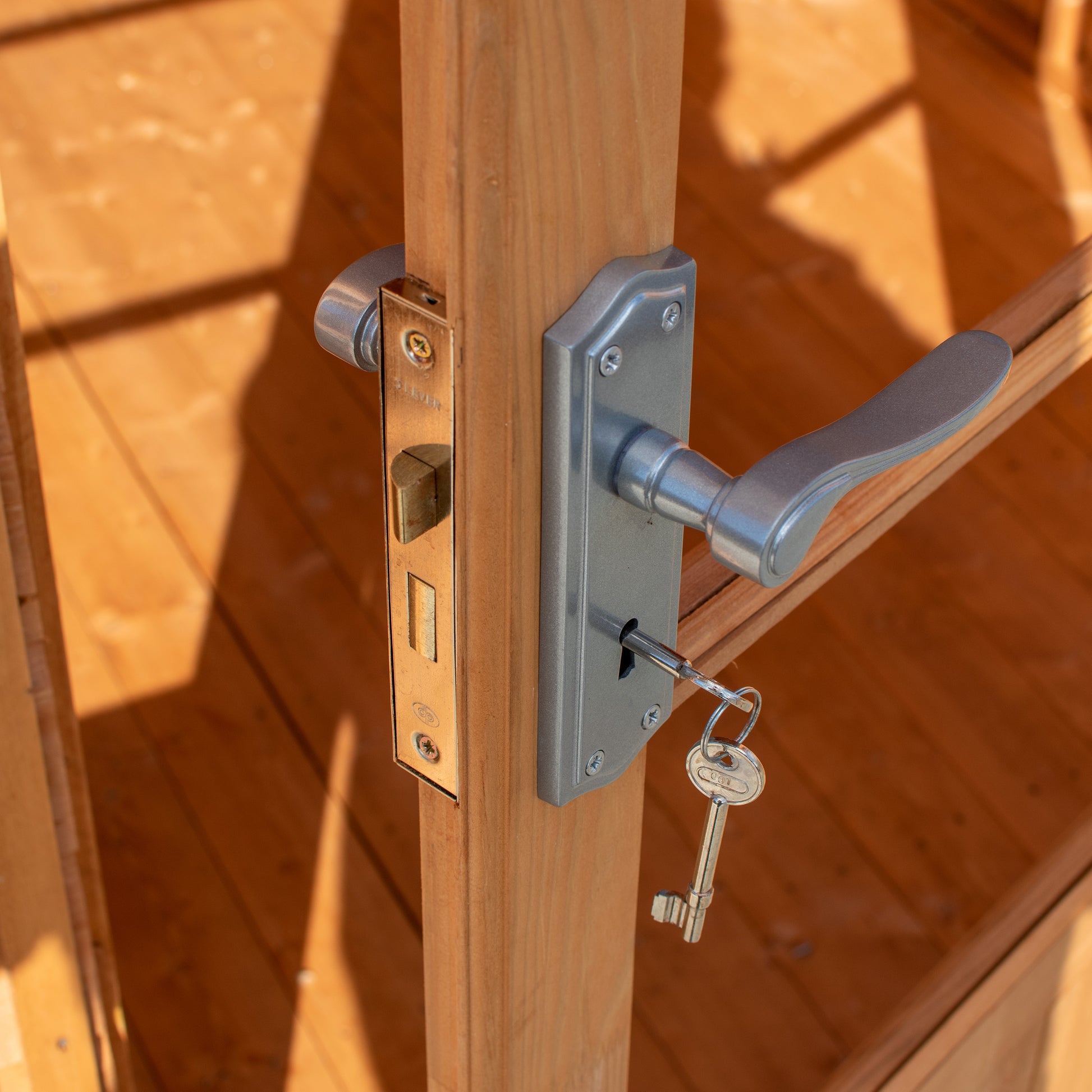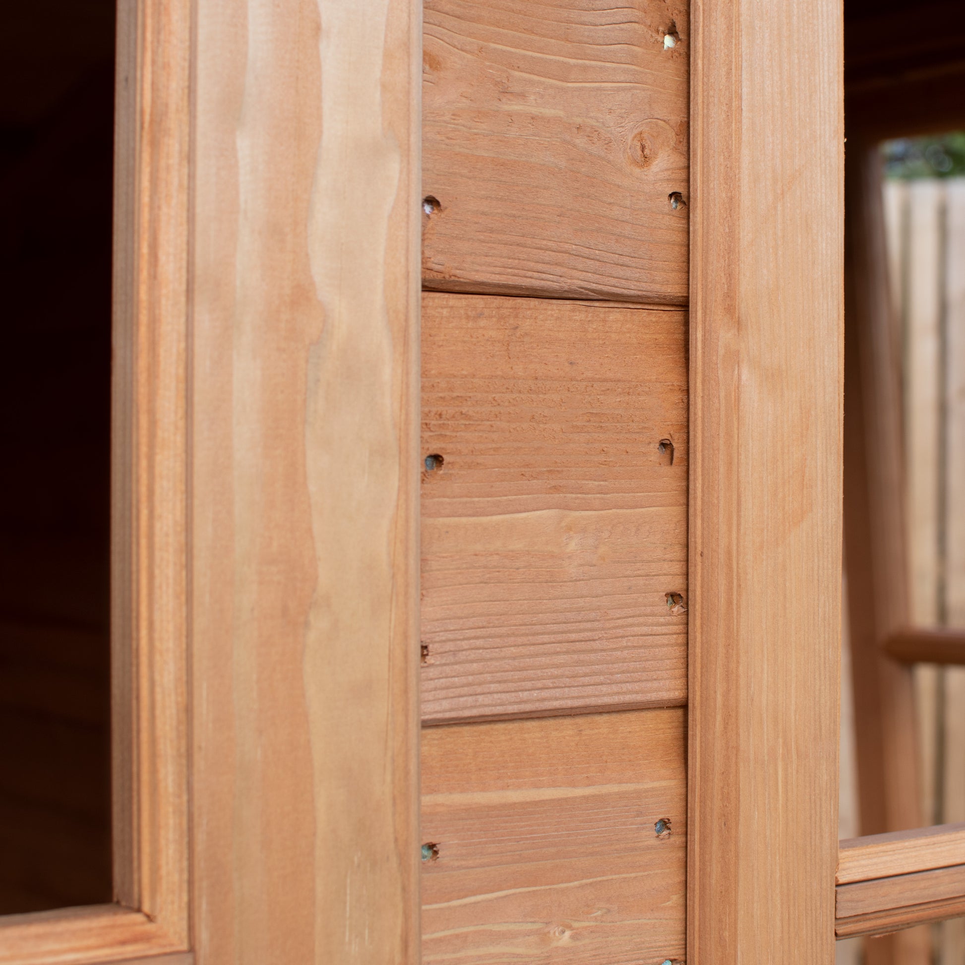 | The design of the stunning, handmade Orchid Summerhouse really stands out from other summer houses! Its signature curved roof has many advantages both shedding rainwater effectively but also gives an unobtrusive roof line. This garden room is perfect for reading, dining or relaxing! The lockable door opens out to the front with a small canopy over. There are four opening glass windows to provide lots of ventilation. The building is constructed on sturdy 34mm square framing and clad with planed shiplap tongue and groove boards made only from the highest grade, slow grown, FSC approved, slow grown pine. The floor is 12mm T&G boards and the roof is 12mm Plywood with mineral felt supplied to complete the exterior. Dipped base coat preservative ready for you to top coat. |