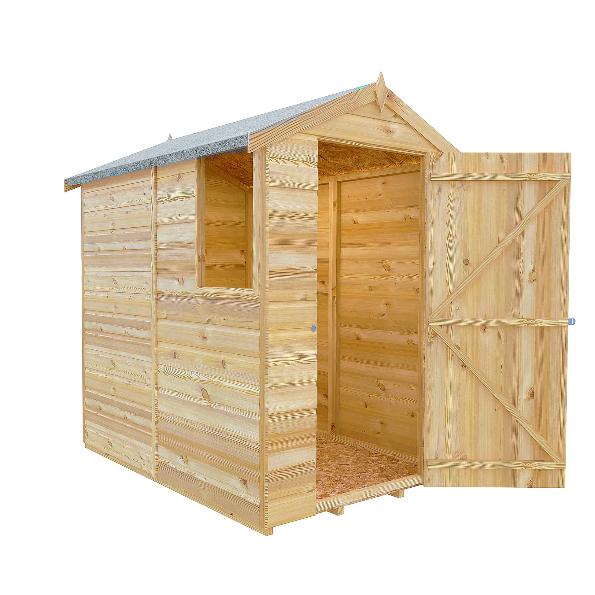 A popular garden shed which is manufactured from high grade, FSC approved timber with 12mm shiplap tongue and groove cladding over sturdy 34mm square framing with OSB roof and floor. With one fixed, glass window that can go either side and a single door.